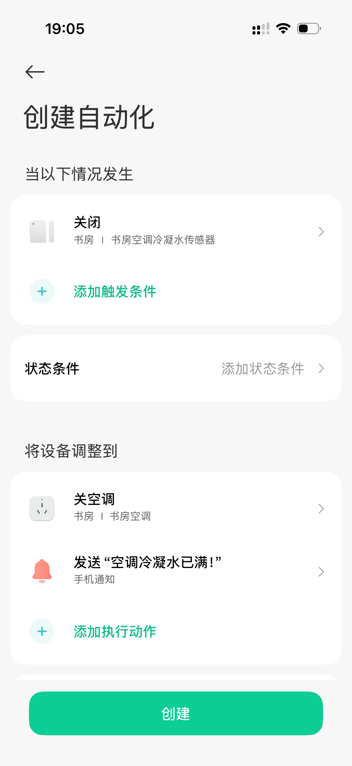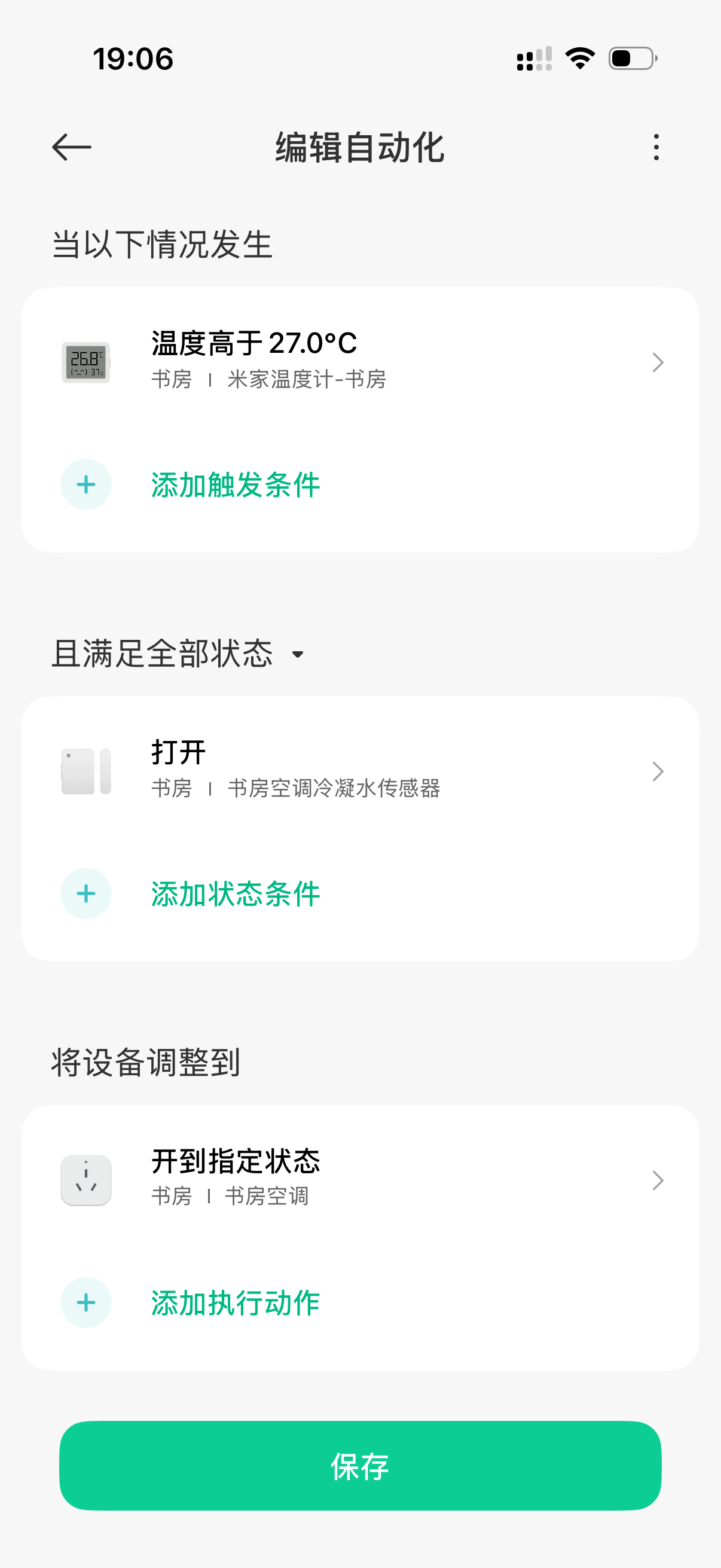 基于此在米家加俩自动化规则解决: ✅ 水淹到传感器探头→关空调 ✅ 空调温度超过阈值 AND 水不满→开空调